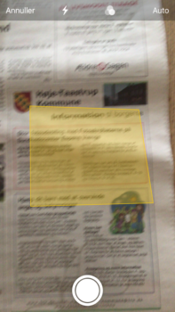 Nu forsøger kameraet at indkredse dokumentet, det valgte bliver “gult”. Er det kun et afsnit du vil skanne så flyt telefonen så det kun er afsnittet der bliver markeret.